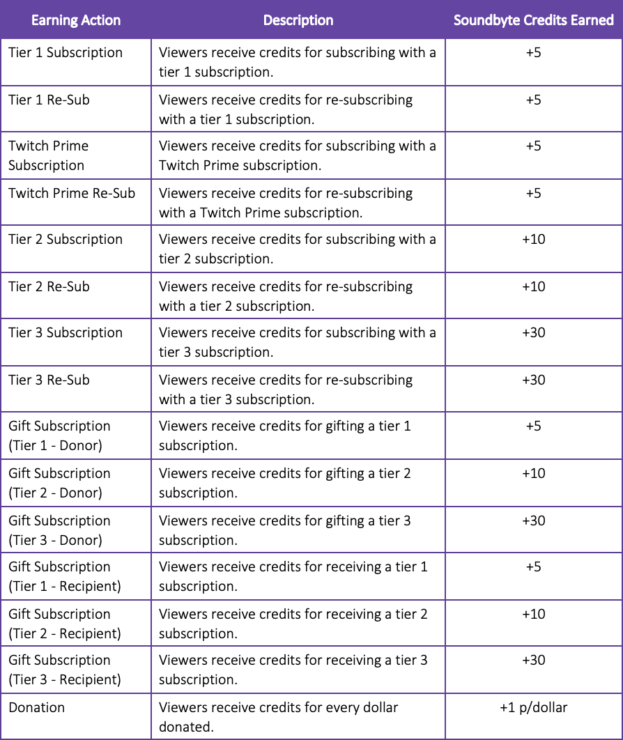 Below you can find the current earn rates for Soundbyte Credits through various actions. These rates are subject to change.
